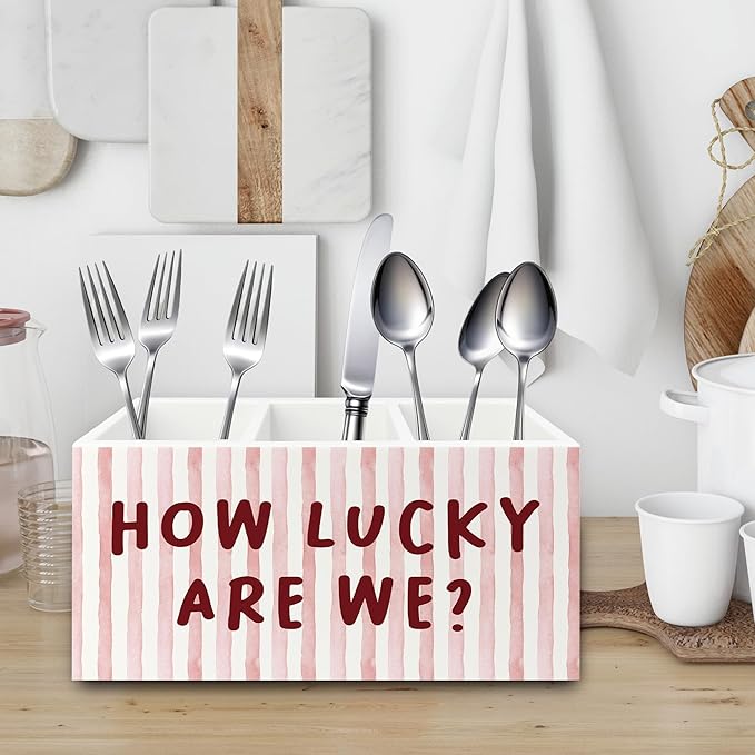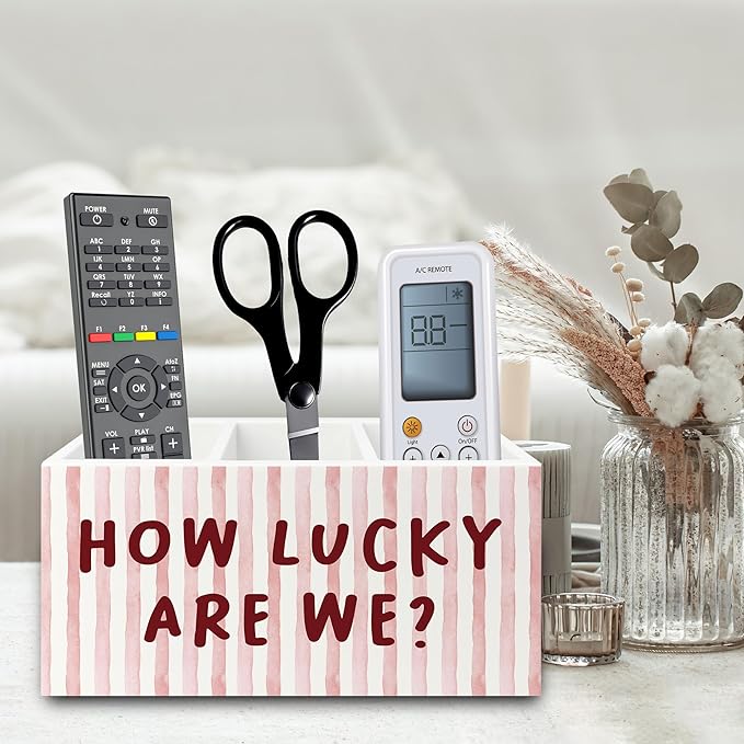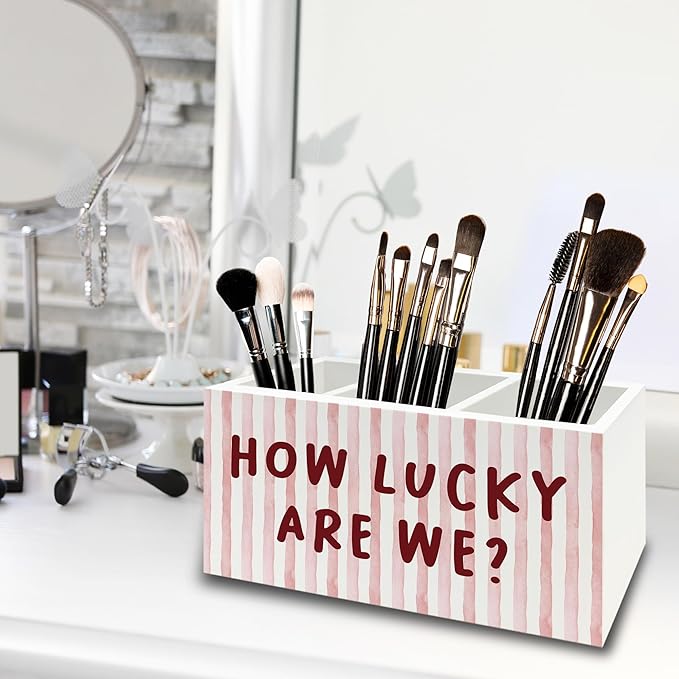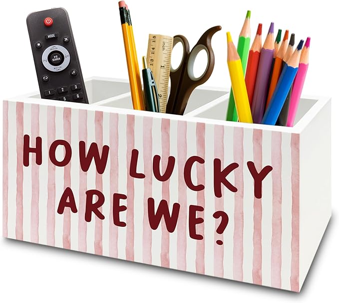 Pink Inspirational Pen Pencil Holder Organizer for Desk, Thank You Gifts for Women, Pink Striped How Lucky Are We Motivational Wooden Box Sign for Home Office Desk Tabletop Decorations