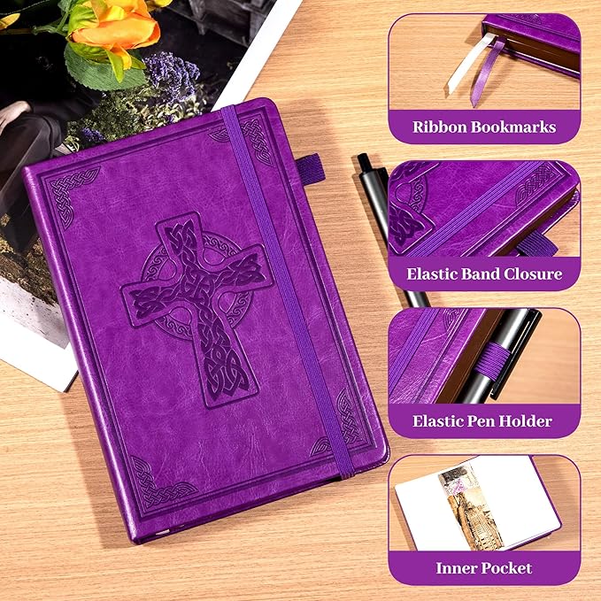 CAGIE Leather Lined Journal Notebook for Men & Women, Debossed Cross, 320 Pages 100 GSM Thick Paper, A5 Hardcover Journaling Notebooks for Writing, 5.7'' X 8.3'' Diary, Purple