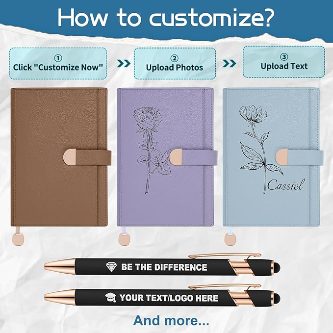 - 【Professional Notebook Personalization】From the premium PU leather cover of our custom notebooks to the matching metal pen, advanced UV printing technology is used to engrave your unique mark. This process not only produces clear and vibrant images but also ensures the design is durable and long-lasting. Whether it's to project a professional image or as a thoughtful gift, our customization experience perfectly meets your needs, helping you easily create a truly personalized notebook.